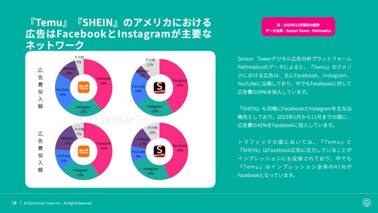 『Temu』および『SHEIN』は、アメリカにおいて、主にFacebook、Instagram、YouTubeに広告を出稿しています。『Temu』は、2023年1月から11月までに、Facebookに2億ドルを超える広告費を投入しており、これは総広告費の39%に相当します。『SHEIN』にとってもFacebookが主な広告出稿先で、2023年1月から11月までに広告費の42%をFacebookに投入しています。