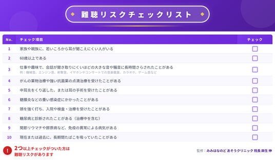 難聴リスクチェックリストを監修した「みみはなのど・あそうクリニック」院長の麻生伸先生は「難聴は進行に気づきにくく、放置すると認知機能の低下を加速させる要因にもなるため、早期対処が不可欠です。補聴器を”隠すもの”から”魅力的で便利なツール”へとパラダイムシフトを起こすことが、聞こえに悩む方の背中を押し、早期受診につながると確信しています」とコメントしています。