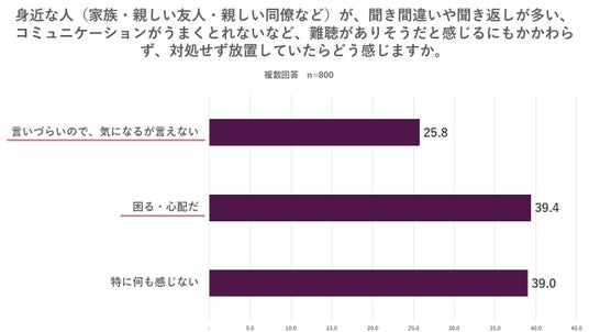 一方で、難聴を抱えていそうな身近な人が、対処せず放置していた場合にどう感じるか聞いたところ、「困る・心配だ」または「気になるが言えない」と回答した人は61.0%に上り、身近な人が難聴を放置していることを気にかけている人が多いことがわかりました。