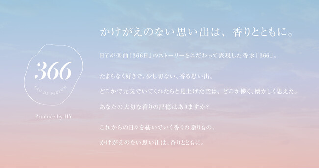 HYのメンバーが楽曲「366日」をイメージして香水を制作。10種類もの香料をブレンドし、楽曲の持つイメージの香りに仕上げました。HYメンバーからのメッセージカードも特典としてお届けいたします。