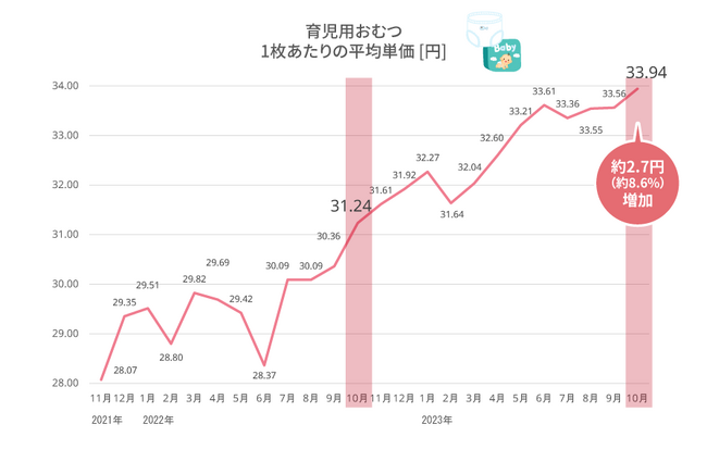 まず「育児用粉ミルク」の1gあたりの平均単価を2023年10月と1年前(2022年10月)で比較すると約0.4円(約18.3%)増加しています。また、1缶あたり800gの場合は1年間で平均約319円(約18.0%)増加しています。次に、「育児用おむつ」1枚あたりの平均単価を見てみると、1年前(2022年10月)から約2.7円(約8.6%)増加していることが分かりました。