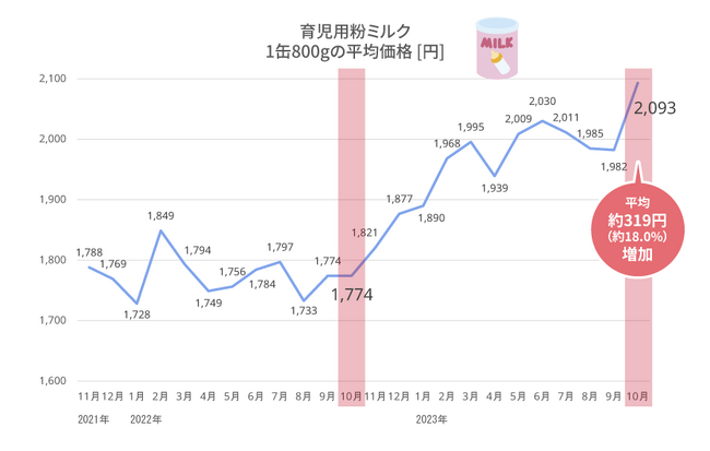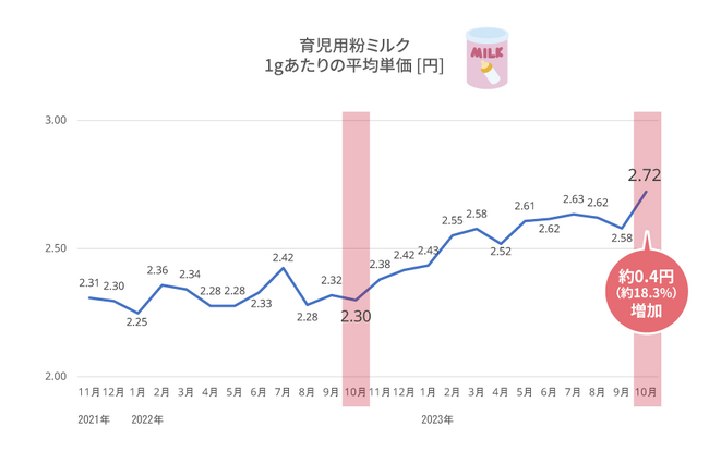 11月19日は「いい育児の日」。昨年10月に育児・介護休業法の改正により「産後パパ育休(出生時育児休業)」が施行されたことで、男性の育休取得率が今年30%を超えるなど、育児環境が変化しています(*1)。しかし、最近の物価高騰は子育て家庭にも影響を及ぼしており、今回は子育て必需品である「育児用粉ミルク」「育児用おむつ」の価格動向に注目します。