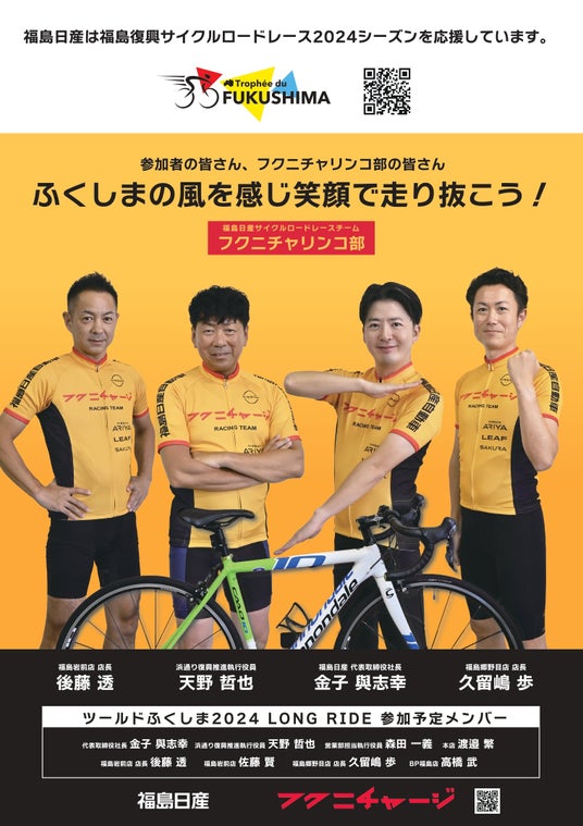 福島日産自動車株式会社(以下福島日産と略、本社:福島県福島市、代表:金子 與志幸)は、福島復興サイクルロードレースシリーズに年間を通して協賛しております。2024年9月14日(土)・15日(日)の2日間、Jヴィレッジ(福島県双葉郡)を起点に浜通り15市町村を舞台に開催された「ツール・ド・ふくしま」では、日産自動車株式会社(以下、日産自動車と略、本社:神奈川県横浜市)、日産プリンス福島販売株式会社(以下、日産プリンス福島販売と略、本社:福島県福島市)と共に福島県の"オール日産"として、ブース出展をはじめ大会車両の提供を行いました。ロングライド浜街道ライド110では、福島日産神谷店日産前を通過、日産自動車いわき工場にて給水などの休憩を行いました。神谷店前やいわき工場では福島日産・日産関係者が選手に声援を送りました。また参加者としても、福島日産からはロングライド、日産自動車からはロードレースに参加をし、大会を盛り上げました。
