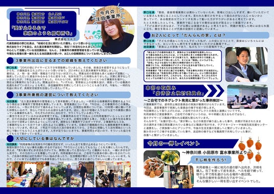 『だんらん日和』は、全国の「だんらんの家」で働く職員や経営者の声、地域とのつながり、新たなチャレンジを、毎月一つひとつ丁寧に取材・編集して届ける月刊広報誌です。加盟事業所のリアルな取り組みや、開業を目指す方々の想い、本部の支援内容などをオープンにすることで、「だんらんの家」の価値や魅力を、より多くの方に知っていただくことを目指しています。