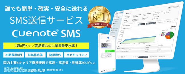 Cuenote SMS(キューノート エスエムエス) は、携帯電話番号宛にSMS(ショートメッセージ)を簡単に送ることができるクラウドサービスです。国内携帯キャリアとの直接接続による高品質なSMS配信が可能で、本人認証や重要な通知はもちろん、効果の高いプロモーション手段として多くの企業・団体にてご利用頂いております。
