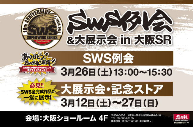 模型・玩具商品の企画、製造、小売を手掛ける株式会社ボークス(京都市下京区)は、飛行機インジェクションプラキット「造形村SWS(スーパーウイングシリーズ)」10周年記念イベントを2022年3月12日(土)~27日(日)にボークス大阪ショールームにて開催いたします。26日(土)には「SWS例会」と銘打ち、トークショーや抽選会、スケールモデル制作の生実演を実施。長年シリーズを応援し続けてくださっている方から初心者まで、あらゆる飛行機模型ファンがお楽しみいただける「作るホビー」の楽しい一日をお届けします!