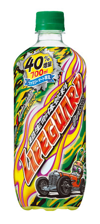 「超生命体飲料ライフガード」(500ml)は、全国のファミリーマートで開催される「お値段そのまま!!40%増量作戦」に初参加。数量限定で、スペシャルメガボトル「メガライフガード」(700ml)を販売します。