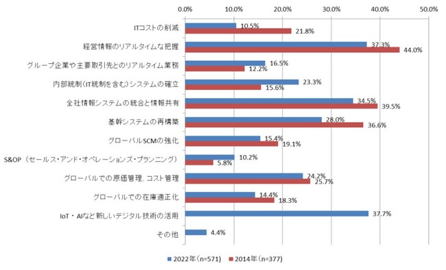・「全社情報システムとの統合と情報共有」「経営情報のリアルタイムな把握」などのテーマについては、変わらず重視されており、基幹システムの利活用において、海外拠点を含む経営データの把握や管理の重要度は依然として高い。