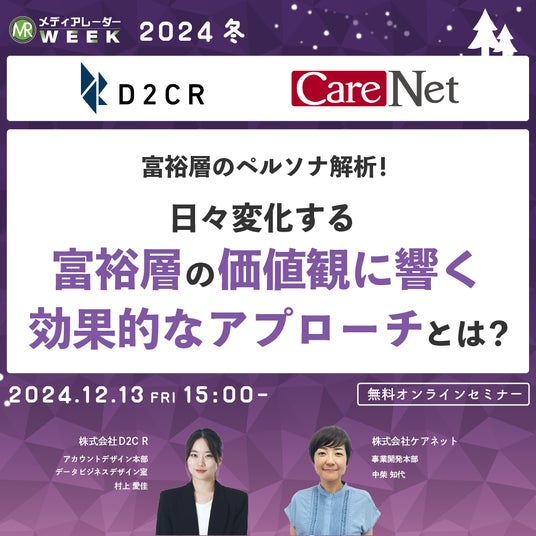 株式会社D2C R(本社:東京都港区、代表取締役社長:豊永 雅史、以下D2C R)は、株式会社アイズ(本社:東京都渋谷区、代表取締役社長:福島 範幸、以下アイズ)が主催する「第16回メディアレーダーWEEK 2024 冬」の無料オンラインセミナーに、当社アカウントデザイン本部の村上 愛佳が登壇することをお知らせいたします。
