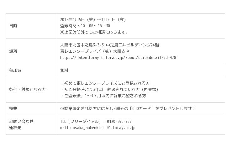 東レ株式会社100%出資会社である東レエンタープライズ株式会社(本社:東京都中央区日本橋)大阪人材サービス部において、【貿易事務・営業事務経験者/特別登録会】を開催します!!