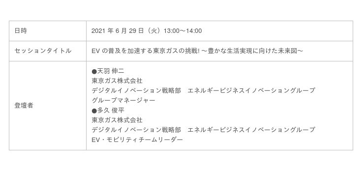 本セッションで登壇する東京ガスは、2030 年に向けたグループ全体のビジョン「Compass2030」において、 「CO2 のネット・ゼロ」、「『価値共創』のエコシステム構築」等の挑戦を掲げ、電力事業への参入などで大きな存 在感を示すとともに、EV 関連サービスなど、新たな分野での事業拡大も目指しています。今回は、現在進行中の取り 組みのなかでも、特に EV 充電サービス事業に関わる挑戦についてお話いただきます。