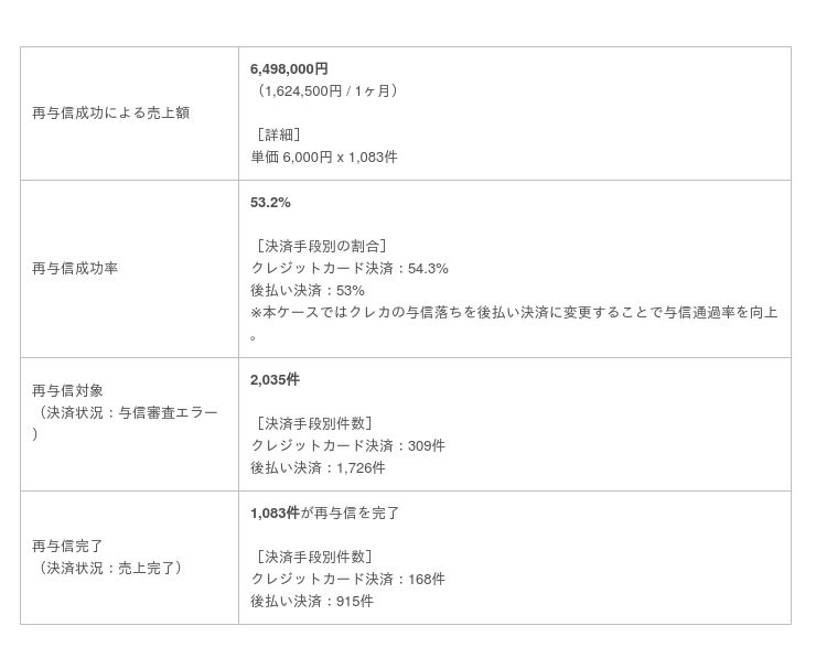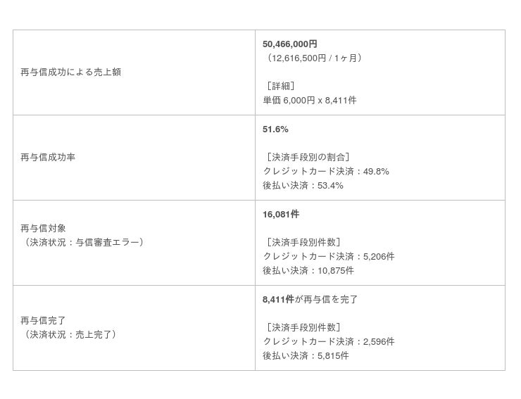 上記先行導入したメーカーでは再オーソリの成功率は52.4%となり、100万円~1,000万円にのぼる売上向上に成功しています。