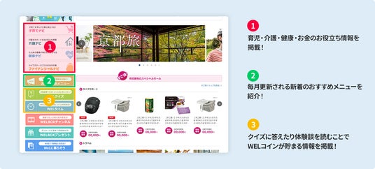 「WELBOX」オリジナルの子育てや介護などの情報、新着のおすすめメニュー、WELコインがもらえるクイズなどの表示をわかりやすく整理することで、見逃すことなくご利用いただけるようになりました。
