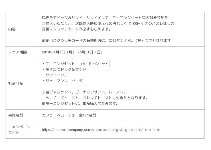 株式会社シャノアール(本社/東京都豊島区、代表取締役社長/中村成佑)は、「ドッグ&サンドフェア」を、全国の「カフェ・ベローチェ」にて2019年4月1日(月)より開催いたします。