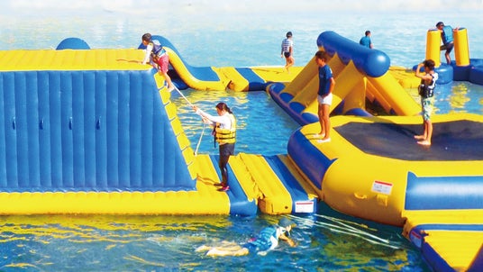 茨城県では初となる水の上に浮かぶエア遊具のウォーターアスレチック。