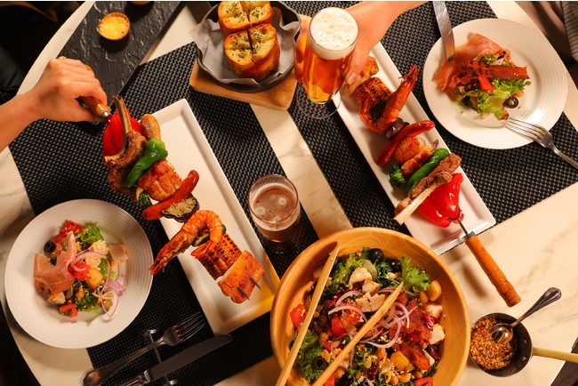 メインはインパクト満点の串料理、「ポム・ダダン ブロシェット」。シーフードやお肉、お野菜をそれぞれ丁寧に下ごしらえして焼き上げます。ブロシェットから外したお料理をひとつずつゆっくりと味わっても、もちろん串のまま豪快に召し上がってもOK!「写真映えするブロシェットを撮影し、SNSに投稿しながら、皆様でテラスでのひとときをビールとともに楽しんでいただきたい」というシェフの想いが込められております。