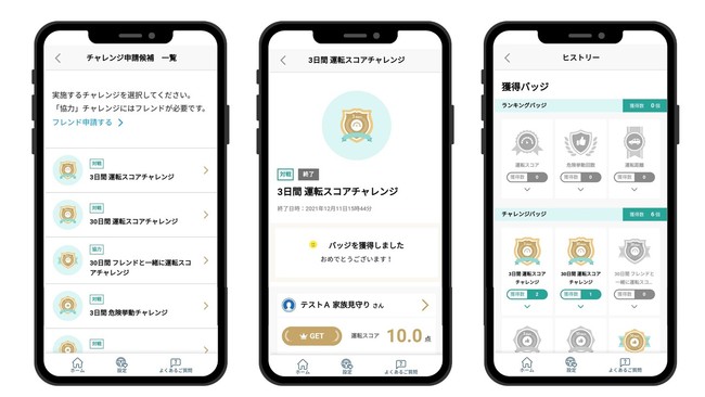 &eアプリを利用しているご家族やご友人と運転スコアをランキング形式で共有できる「フレンド機能」に加え、さまざまなミッションにチャレンジしてバッジを集め、誰でもゲーム感覚で安全運転に取り組める「チャレンジ機能」を2022年1月に新設しました。