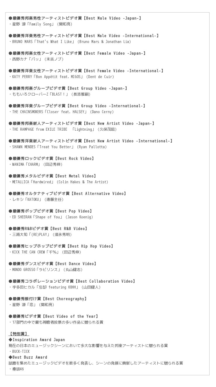 ■「MTV VMAJ 2017」受賞作品一覧