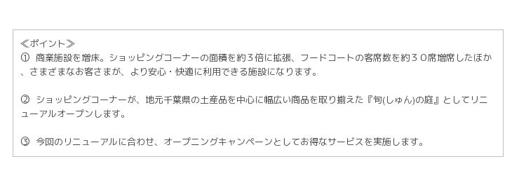 令和元年7月31日(水)に先行オープンしたフードコート及びテイクアウトコーナーに加え、今回、新たにショッピングコーナーを拡張・リニューアルし、地域の魅力をお客さまにお届けします。