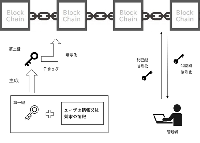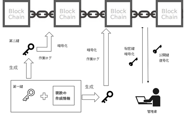 本技術を用いたプログラム及び同プログラムをインストールした端末装置では、第一鍵と複数の指定されたソフトウェアから作成される情報を用いて、複数の第二鍵を作成し、第二鍵にそれらの作業内容を含むログが記録された場合は、当該第一鍵又は第二鍵を用いて暗号化したログをブロックチェーンに記録することが可能となります(図1参照)。