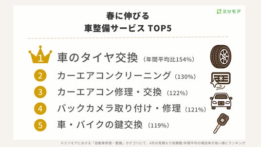 オンラインで見積もりの比較・受発注ができるサービス「ミツモア」を運営する株式会社ミツモア(本社:東京都中央区、代表取締役:石川 彩子)は、春先における車の整備サービスの依頼傾向を調査しました。
