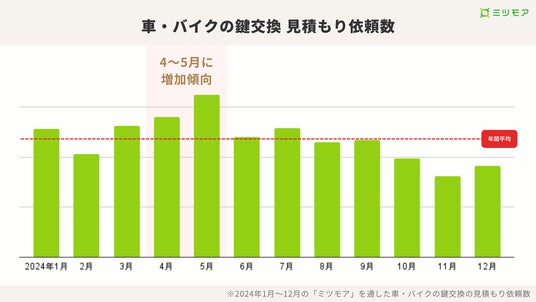 車やバイクの鍵の交換依頼は、4月~5月にかけて増える傾向があります。「鍵を紛失して交換した」というユーザーの声も多く、引越しや荷物の移動が増える時期特有の慌ただしさが原因の1つと考えられます。