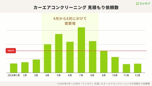 気温が上昇し始める4月は、夏本番に向けてカーエアコンクリーニングのニーズが高まり始めます。2024年のデータによると、4月の依頼数は3月から2倍以上に増加しました。