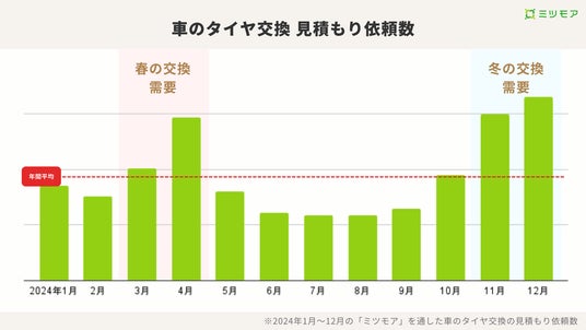 4月は、冬タイヤから夏タイヤへの履き替え需要がピークを迎える時期です。3月から4月にかけて見積もり依頼数が急増し、5月には再び落ち着く傾向にあります。
