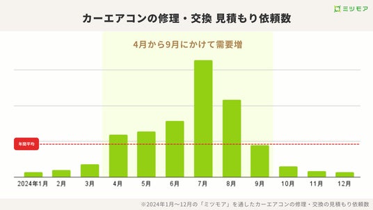 カーエアコンの修理や交換も、4月から依頼が増加します。2024年のデータでは、4月の見積もり依頼数が3月の3倍以上でした。