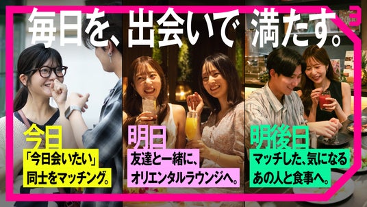 株式会社Mrk&Co(本社:東京都渋谷区、代表取締役:上條景介)は、マッチングアプリ「Dine(ダイン)」を全面リニューアルし、新ブランド「D³(ディースリー)」として本日より提供を開始いたします。本リニューアルにより、従来の「食事デートがすぐに決まる」というダインのマッチングアプリとしての強みをそのままに、日本最大の相席ラウンジ「オリエンタルラウンジ」「ag」の新公式アプリとしての役割も担ってまいります。