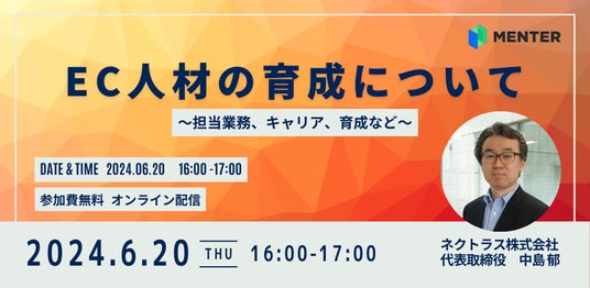 マンガ形式のDX人材育成サービス「MENTER」を提供するWHITE株式会社(本社: 神奈川県横浜市、代表取締役: 横山 隆) は、ネクトラス株式会社 代表取締役の中島氏をお招きし、EC 業界の未来を担う人材を育成するためのオンラインセミナー「EC人材の育成について ~担当業務、キャリア、育成など~」を6月20日(木)16:00からZoomにて無料で開催することをお知らせします。