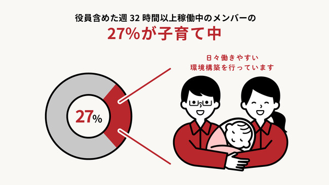 ◎役員含めた週32時間以上稼働中のメンバーの27%が子育て中です。過去には役員が時短勤務を実施するなど、様々なバックグラウンドの方が働きやすい環境構築を行ってきました。