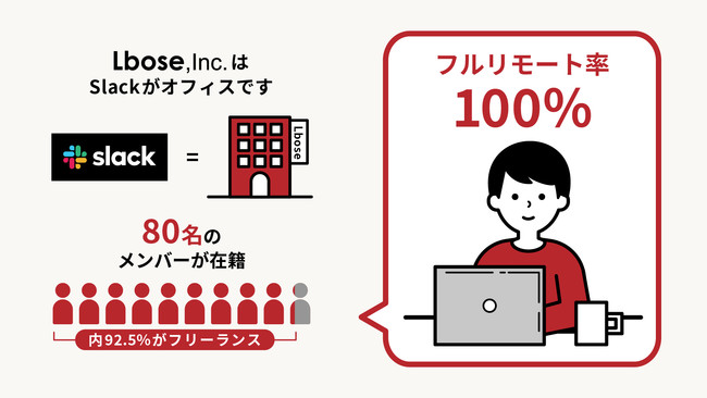 ◎フルリモート率100%のLboseでは、slackがオフィスです。Lboseのslackには80名のメンバーが在籍し、内92.5%がフリーランスというメンバー構成です。