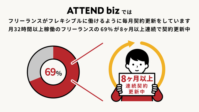 ◎フリーランスがフレキシブルに働けるように毎月契約更新を行っており、月32時間以上稼働のフリーランスの69%が8ヶ月以上連続で契約更新中、最長メンバーは23ヶ月連続で契約更新中です。