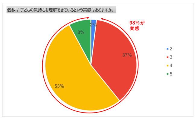 1.参加者の98%がこの研修を通じて「子どもの気持ちを理解できているという実感がある」と回答。子どもの姿を捉える手段としてドキュメンテーションが有効であることが分かります。