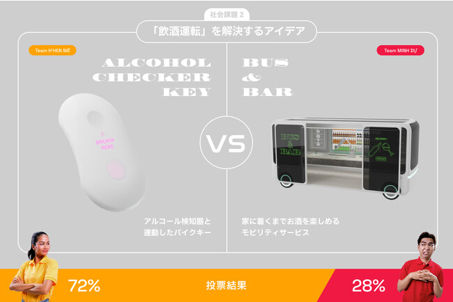 ベトナムでは飲酒運転による交通事故が多発しています。そこで、飲酒運転のないベトナムの交通社会をつくるアイデアを提案。バイクキーとアルコール検知器を連動させ、呼気からアルコールを検知するとキーが出てこない仕掛けの「アルコールチェッカーキー」が勝利しました。