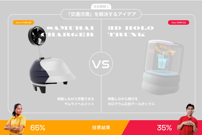 バイク大国であるベトナムは交通渋滞が大きな社会課題で、運転中や信号待ちの際の携帯電話の使用も渋滞を引き起こす原因の一つとなっています。これらを解決するためのアイデアバトルを実施。移動しながら携帯電話を充電できるヘルメット型「サムライチャージャー」が勝利しました。