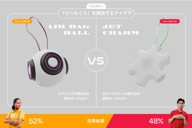 ベトナムではスリやひったくりといった軽犯罪が頻発しており、観光客や高齢者、女性が被害を受けています。この問題に対する2つの防犯アイデアを提案。盗難に遭った時にエアバックが作動し、警告音で周囲に知らせるキーホルダー型の「エアバッグボール」が僅差で勝利しました。