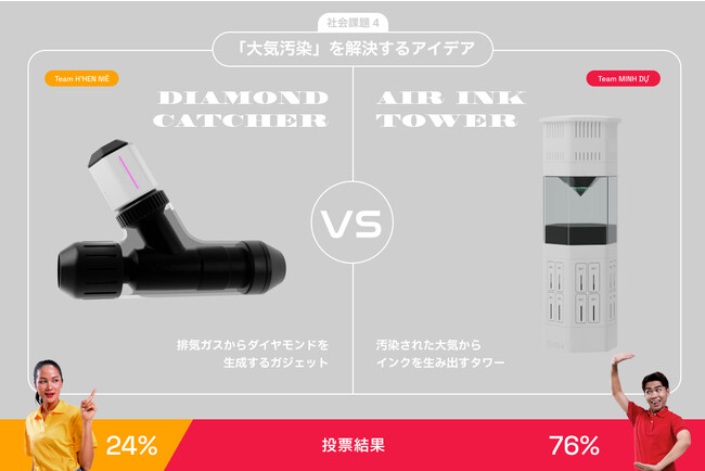 ベトナムの都市部ではバイクや自動車、工場などから排出されるガスにより大気汚染が進み、環境面や健康面にも影響を及ぼしています。これらを解決するアイデアを提案し、街中に設置して大気汚染物質を吸収し、その場でインクを生成・貯蔵できる「エアインクタワー」が勝利しました。