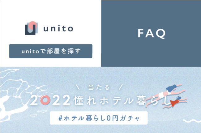 外泊した分だけ家賃が安くなる物件プラットフォーム「unito(ユニット)」を運営する株式会社Unitoは、2022年8月4日(木)より、「#ホテル暮らし0円ガチャ」を開始します。本企画の当選者は、都心の一等地ホテルの1ヶ月無料チケットなど、「家具家電を所有せず」「最短1ヶ月から利用でき」「必要な時だけ住む」暮らしを体験していただけます。