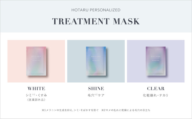 このたび、HOTARU PERSONALIZEDのローション&モイスチャライザーと併せて使用することで、肌悩みの集中ケアで美肌を叶えるフェイスパック「HOTARU PERSONALIZED TREATMENT MASK」1セット(3枚入り)を定期コース2,940円(税込・送料込)にて発売いたします。現在提供しているローション&モイスチャライザーは、肌悩みにダイレクトにアプローチする成分として、たるみ毛穴*1に働きかけるパルミトイルトリペプチド-5*2や、乾燥によるキメの乱れに働きかけるバクチオール*3などを一人ひとりの肌悩みによって配合*4しております。本マスクは、“肌悩みを集中ケアする”ことを目的とし、キー成分を配合した美容液を浸透させたコットン製の顔用マスクです。3枚で1セットとなっており、医薬部外品でシミ*5・くすみ解消に特化した「WHITE」、毛穴ケアに特化した「SHINE」、化粧崩れ・テカリ解消に特化した「CLEAR」の3タイプから自分にぴったりのマスクを選択することが可能です。使用の際は、ローション、トリートメントマスク、セラム、モイスチャライザー、アイクリームの順番で塗布することを推奨いたします。