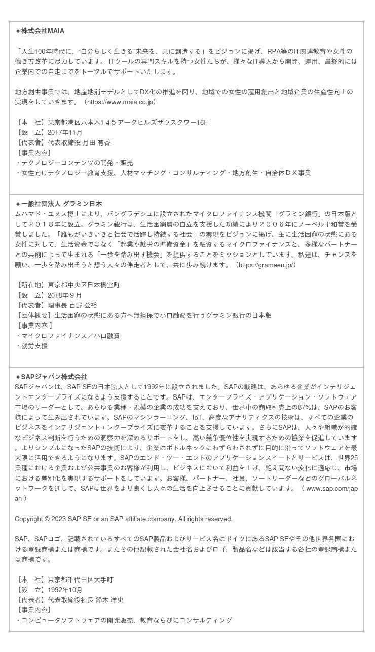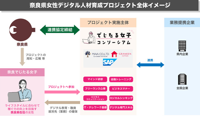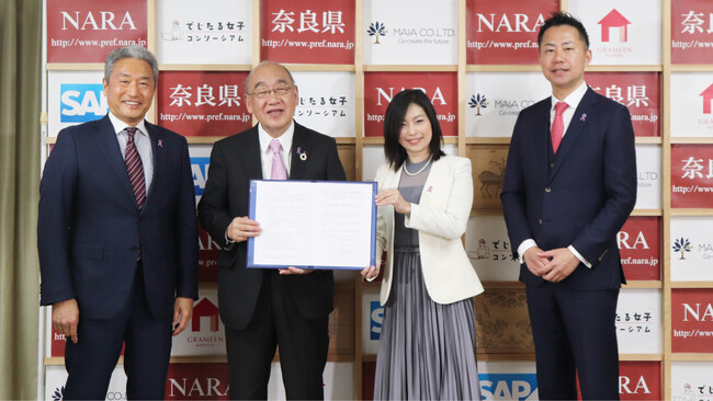 株式会社MAIA(本社:東京都港区、代表取締役:月田 有香、以下「MAIA」)と一般社団法人グラミン日本(所在地:東京都中央区、理事長:百野 公裕、以下「グラミン日本」)、SAPジャパン株式会社(本社:東京都千代田区、代表取締役社長:鈴木 洋史、以下「SAPジャパン」)の3社で構成する「でじたる女子活躍推進コンソーシアム」は、本日3月17日に、奈良県(知事:荒井 正吾)と「奈良県女性デジタル人材育成プロジェクト」に関し連携協定を締結しましたのでお知らせいたします。