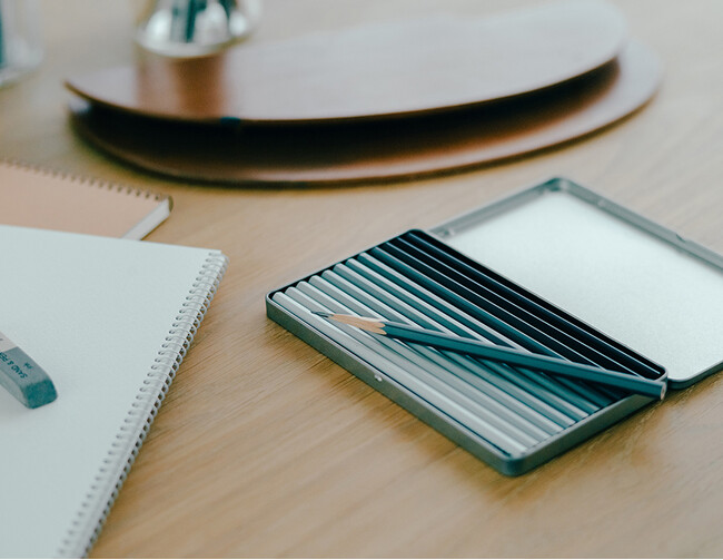創業70年以上の老舗鉛筆メーカー『北星鉛筆』の職人によって作られました。鉛筆の芯部分は日本製で、海外製に比べてやわらかく、デッサンや絵画などに使いやすい描き心地です。12種類の鉛筆セットは硬度別に、鉛筆本体の色がグラデーションになっています。