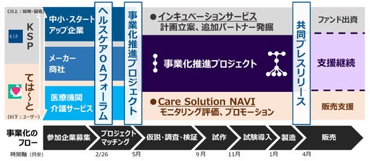 プロジェクトには、フィールドに強みを持つては~とHDの新サービス「Care Solution Navi(TM)」により介護現場やユーザーへのモニタリング評価、プロモーションを推進する一方、KSPが事業計画の立案や追加メンバーの募集をし、プロジェクトの構想と実践の両面からサポートします。
