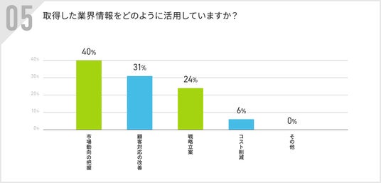 取得した業界情報の活用方法について伺うと、「市場動向の把握」が最も多く40%、次点が「顧客対応の改善」で31%、「戦略立案」で24%と続く結果となりました。