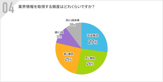 業界情報をどのくらいの頻度で取得するか、という問いには「ほぼ毎日」と答えた方が27%で最多でしたが、「月に数回」、「週に数回」と答えた方もほぼ同じ割合の結果となりました。「週に1回」「月に1回未満」と答えた方は約10%と少ない傾向にありました。