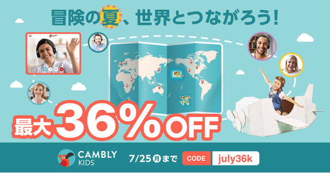Cambly Inc.(本社:アメリカ・サンフランシスコ、日本代表:佐藤 亜希子)が提供する子ども向けオンライン英会話サービス「Cambly Kids(キャンブリー キッズ)」は、7月21日(木)から7月25日(月)までの5日間、Cambly Kids全レッスンプランを最大36%OFFでご利用いただけるセールを開催いたします。
