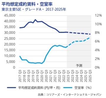空室率と賃料トレンド: 2023年は前年を大きく上回る新規供給量、需要の回復は鈍く、空室率は上昇を予想