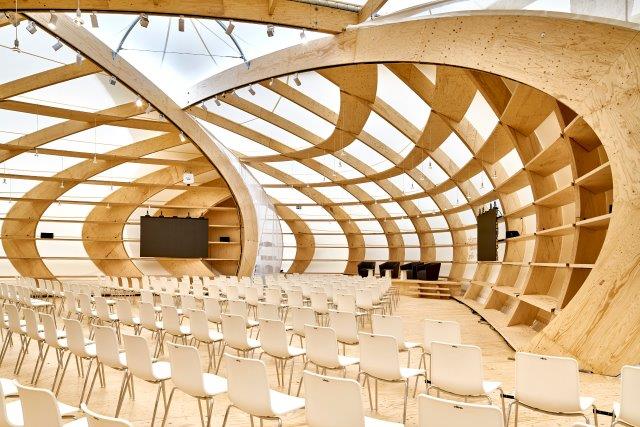 「フランクフルト・パビリオン」は、総面積480平方メートル 、高さ6.5mの自立型木造建築で、960平方メートル の白い半透明の膜素材で覆われています。外から見ると3つの貝が重なっているように見える美しい仮設建築です。「フランクフルト・ブックフェア」では、世界中の作家や書籍業界の専門家、読者が参加するイベントが数多く開催されます。「フランクフルト・パビリオン」は、フェアのメインステージとして朗読会や授賞式、記者会見、音楽や料理のイベントなどのさまざまな行事に利用されました。一定の期間のみ使用される建物でありながらも、作家と読者の出会いを素晴らしい体験の場へと変える貴重な空間として、膜素材がもつ美しい造形が好評を博しました。