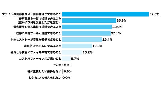 ファイル管理ツールで重視する条件、「自動仕分け・自動整理機能」が57.5%で最多